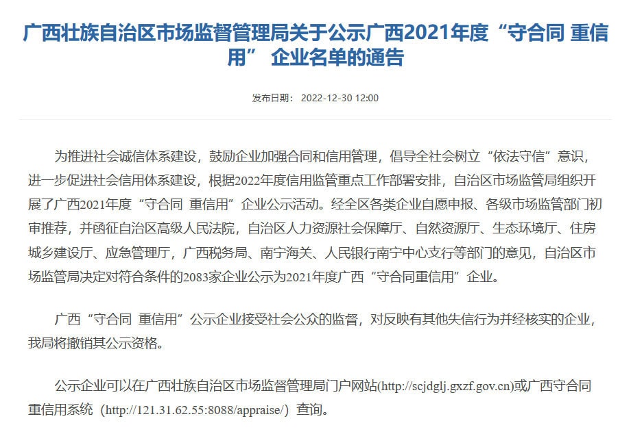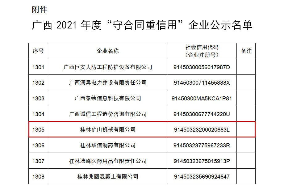 近日,廣西壯族自治區(qū)市場監(jiān)督管理局發(fā)布了《關(guān)于公示廣西2021年度“守合同 重信用”企業(yè)名單的通告》,桂林礦山機(jī)械有限公司憑借誠信的經(jīng)營理念和良好的市場信譽(yù)等優(yōu)勢,榮獲廣西2021年度“守合同 重信用”企業(yè)稱號。